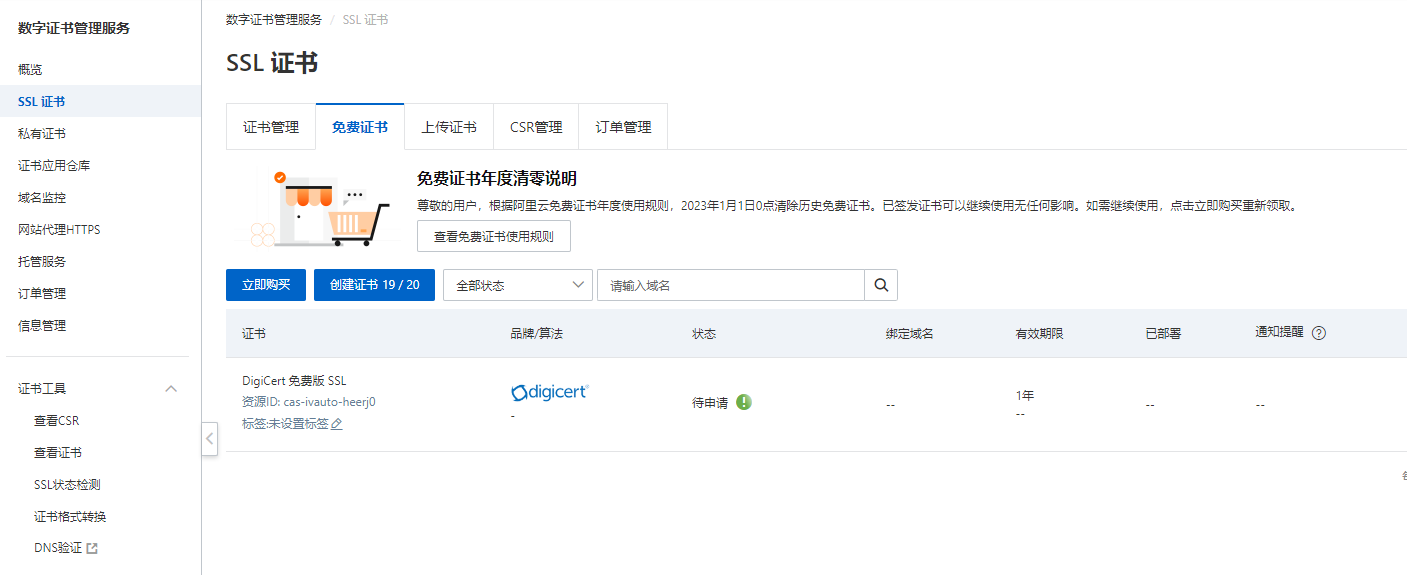 创建证书按钮中的数字表示剩余可申请的免费证书个数/总共可申请的免费证书个数。只有当剩余可申请的免费证书个数不为0时,您才可以创建证书。如果剩余可申请的免费证书个数为0,建议您单击立即购买,获取可用的免费证书个数。