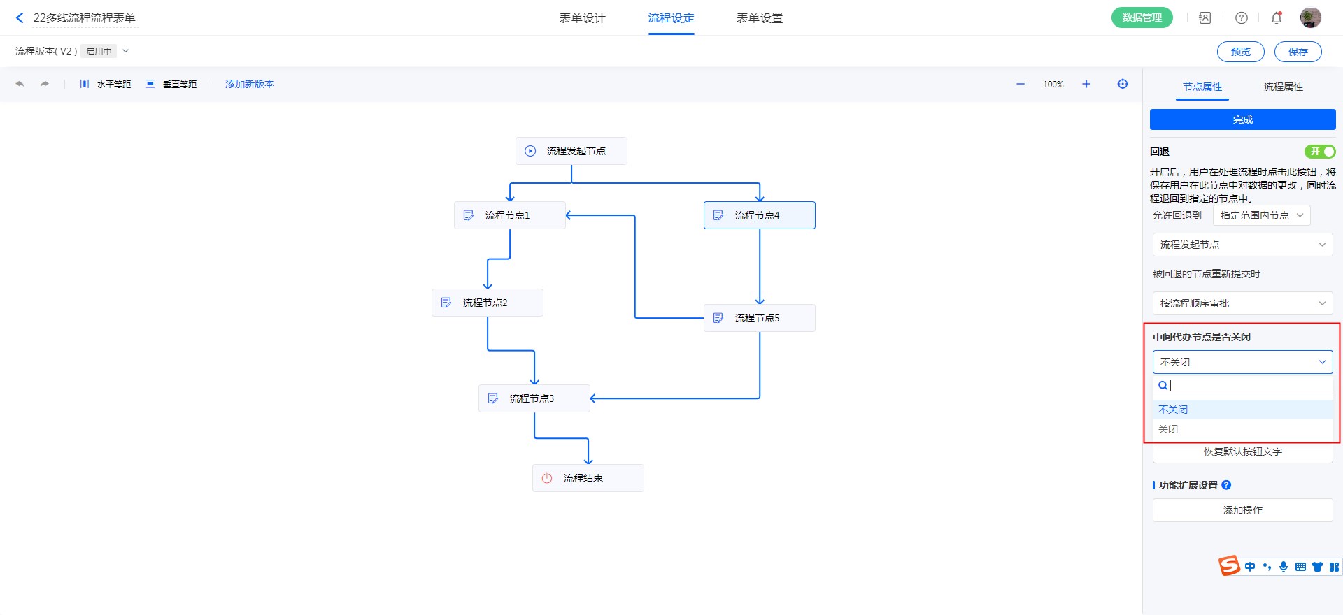 当前节点操作回退到某节点,支持设置中间待办节点是否关闭。