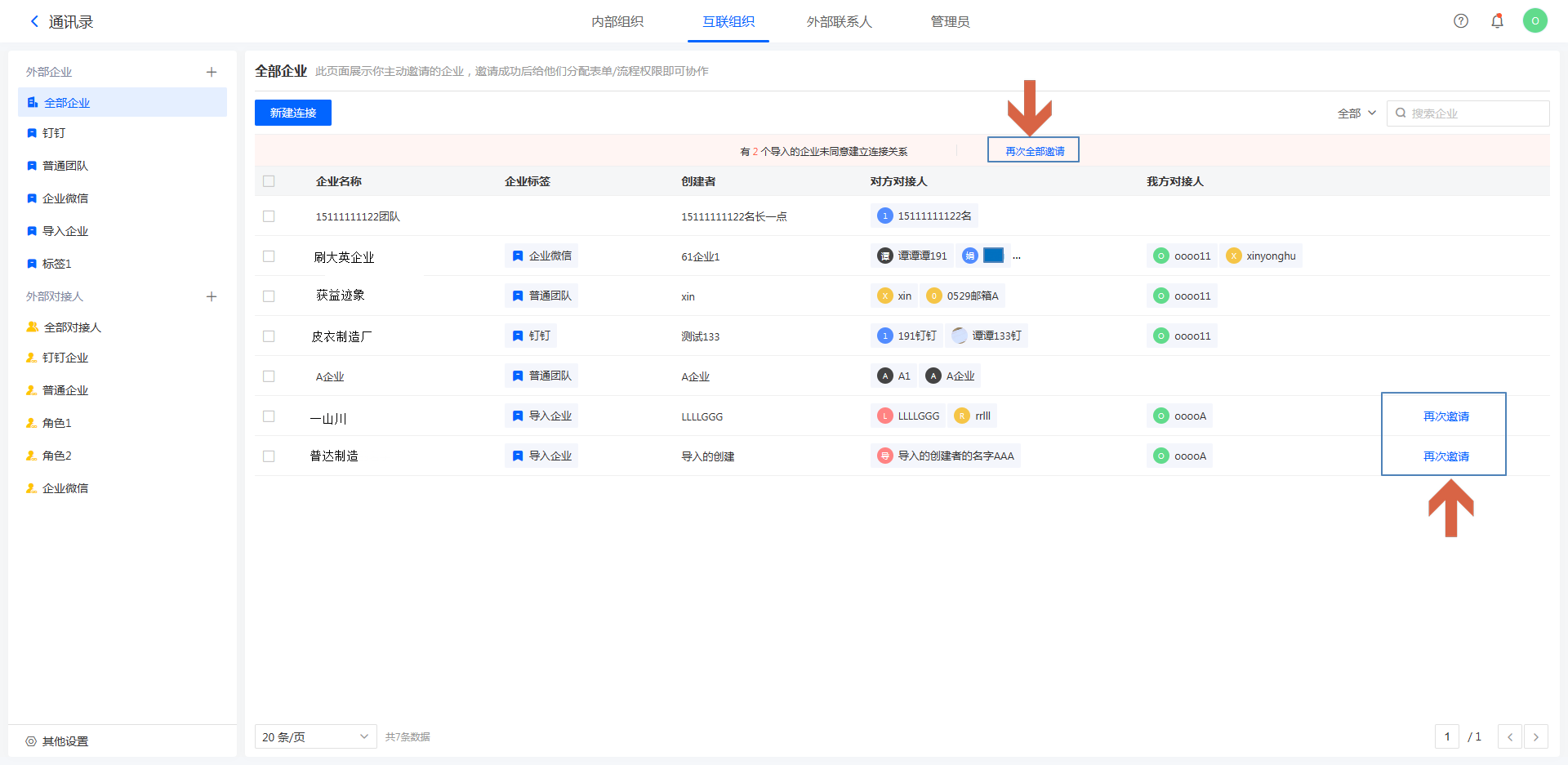 2)若导入的企业未接受邀请,则后续可以再次发送邀请。可以针对单个企业发送,也可以批量发送。如下图所示: