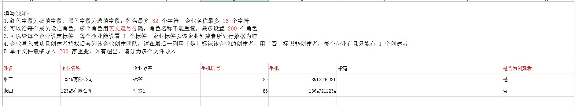 同一企业只能有一名创建者,即同一企业名称下,只能有一个成员标记的为「是」,其他都为对接人,表格里都填写为「否」;
