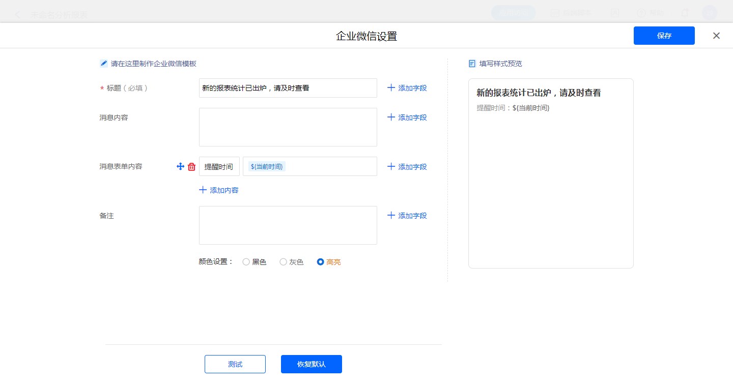 【应用管理】-【报表设计】-【定时提醒】 -【提醒方式】-【企业微信提醒,企业微信设置】