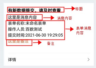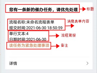 注意:由于企业微信对于消息内容长度有限制,当企业微信消息模板设计的内容过多时,可能会导致收到的内容不全,设计时注意避免!