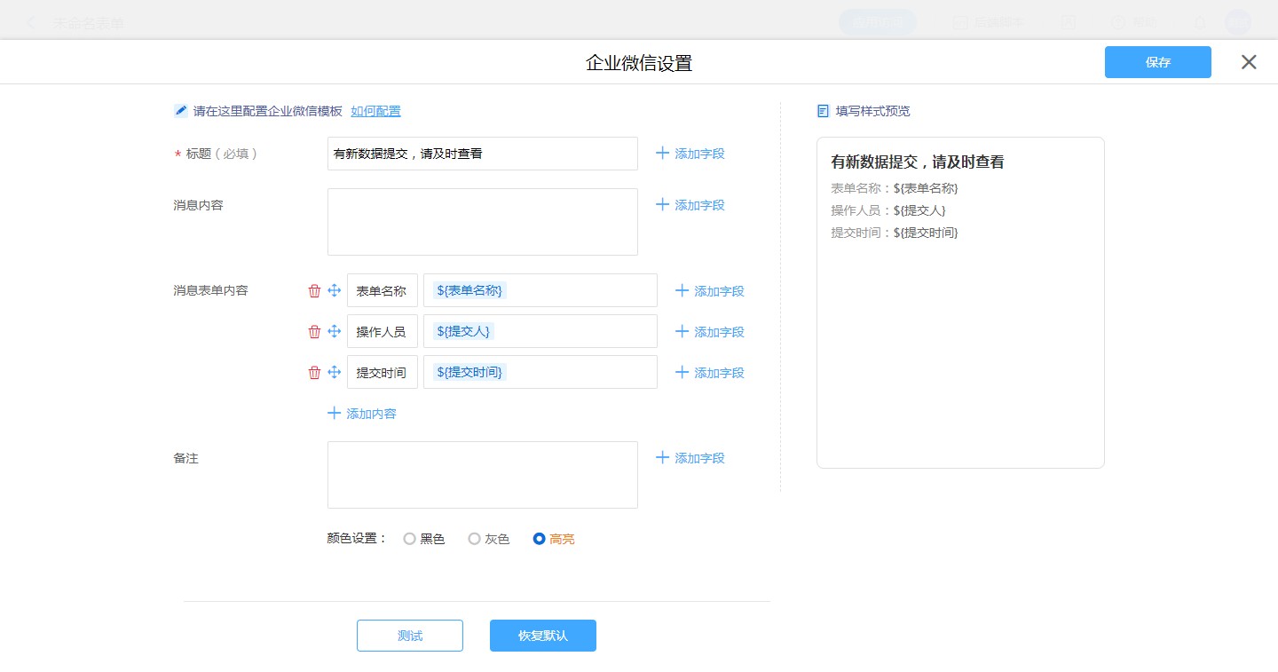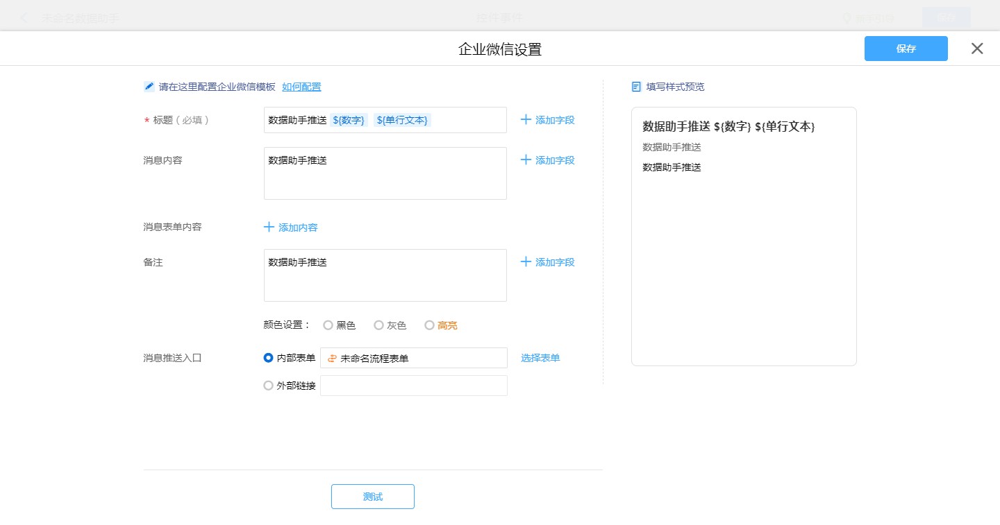 企业微信用户登录,在设计流程表单、普通表单、数据助手消息设置时选择企业微信提醒时,可设置企业微信消息模板。