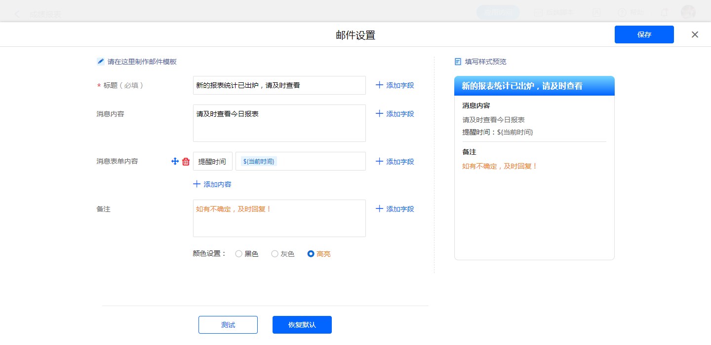 • 标题:必填,支持自定义文字,以及添加[当前时间]字段。