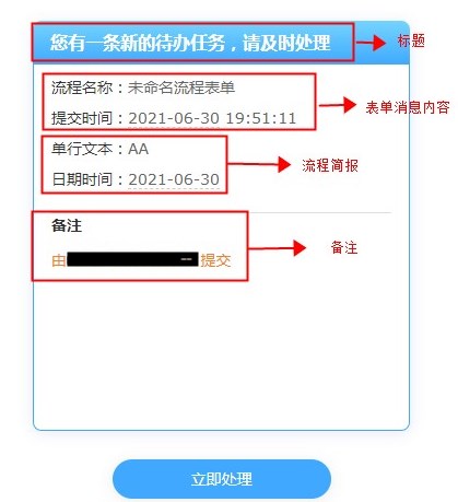 • 系统为流程表单的提交、回退、转交、催办、抄送五种场景类型设置了默认的消息模板。