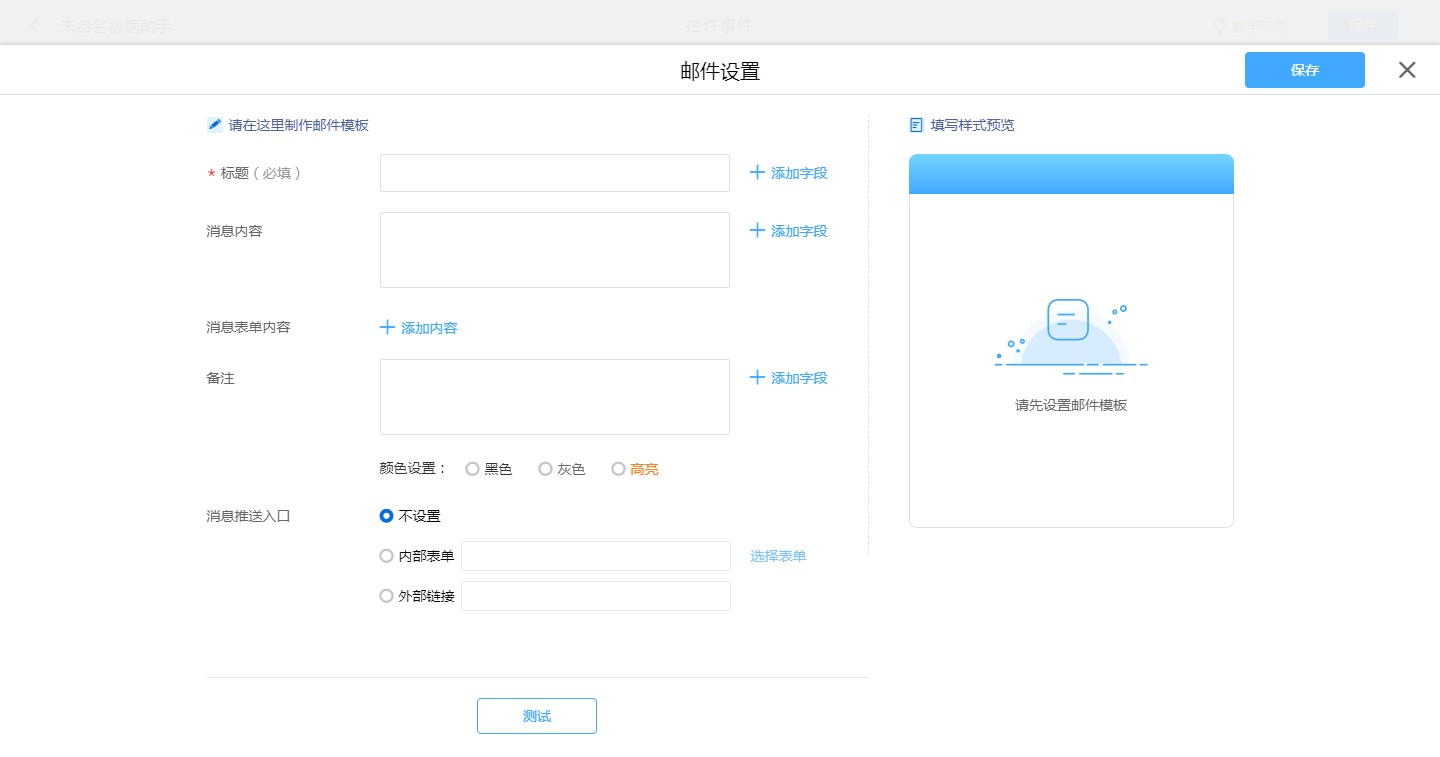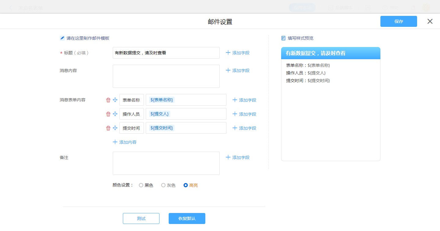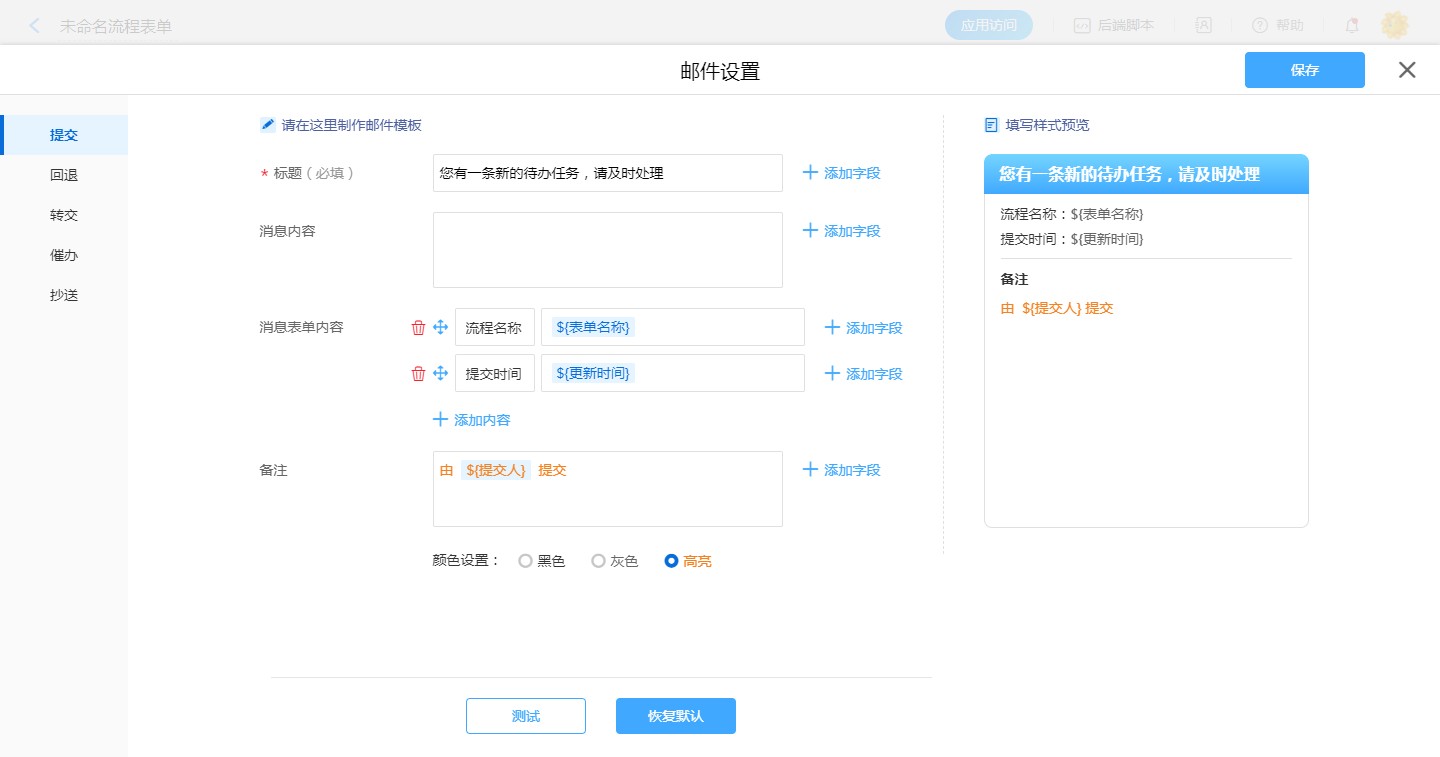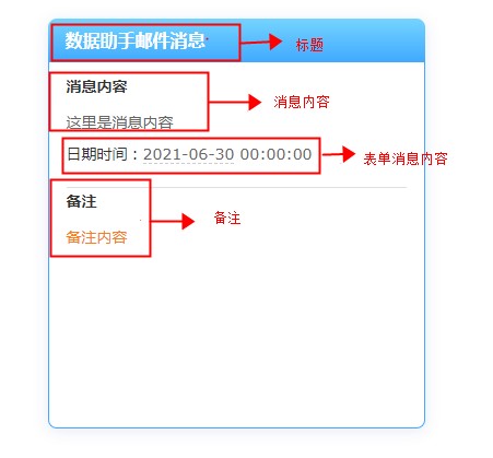 用户在设计流程表单、普通表单、数据助手消息设置时选择邮件提醒时,可设置邮件消息模板。