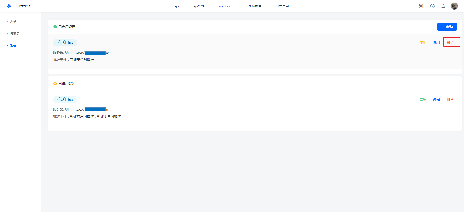 在系统中新建应用和新建表单时,将操作与变更后的数据推送至目标服务器。