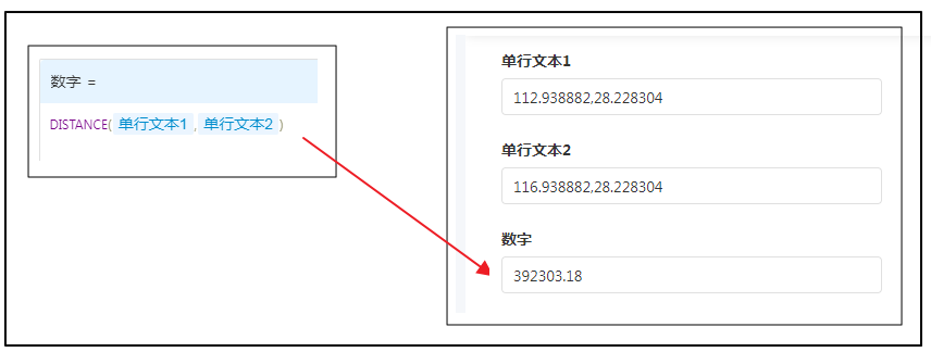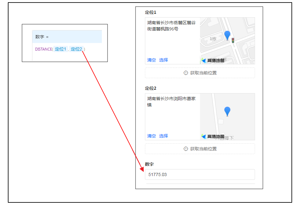 DISTANCE函数用于计算两个定位、两个经纬度坐标、或定位与经纬度坐标之间的距离,单位为米。