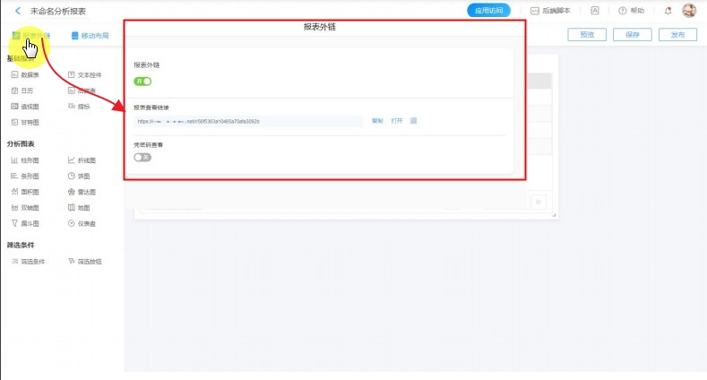 • 开启报表外链:开启后,可以获取到链接,通过此链接可以访问报表。