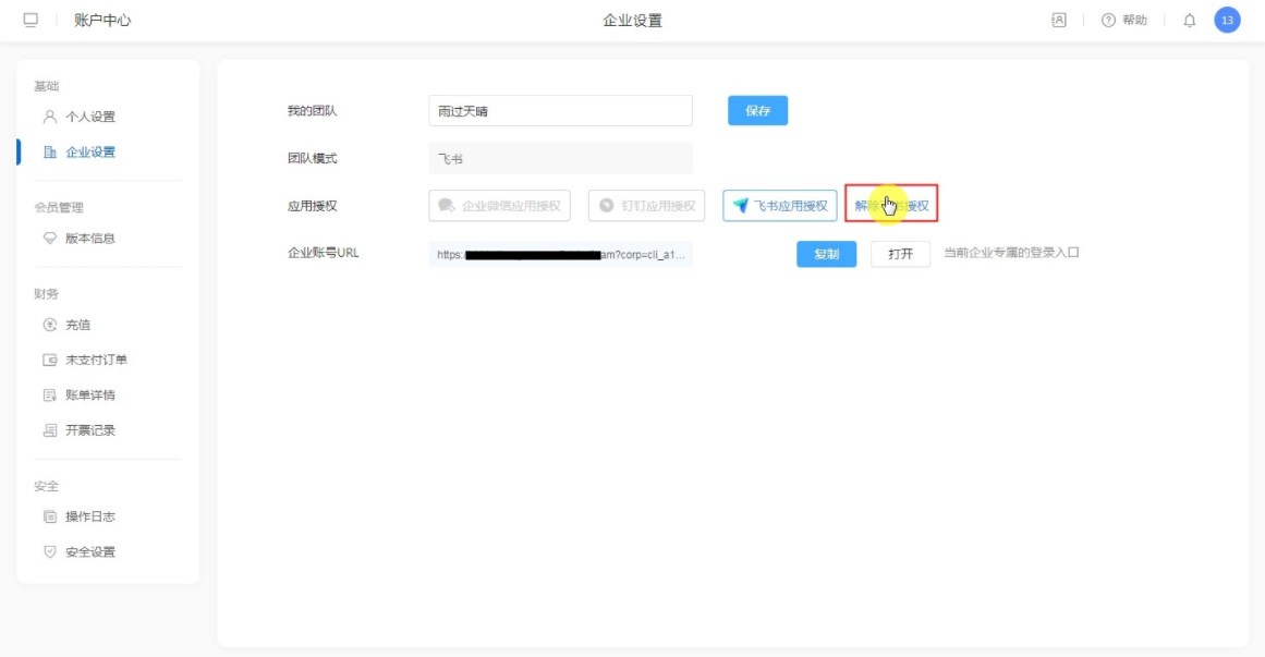 如果公司业务有调整需要解除与飞书的绑定,可以通过【解除飞书授权】链接进行解绑。