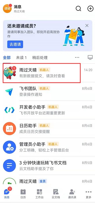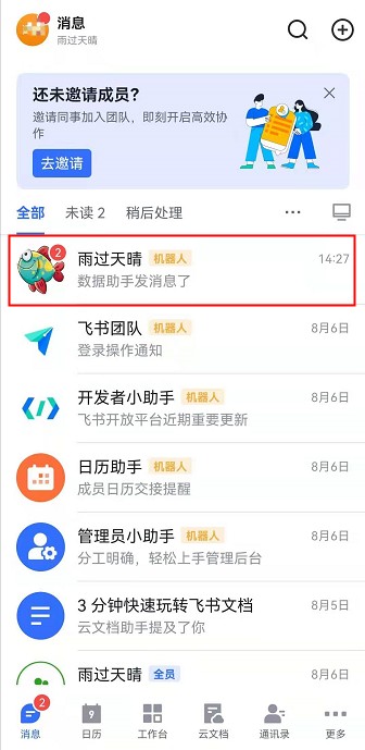 手机飞书上收到数据助手-消息推送的效果: