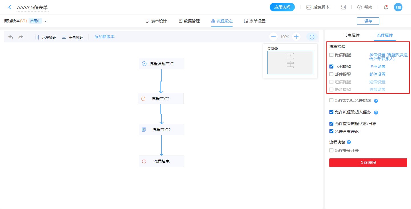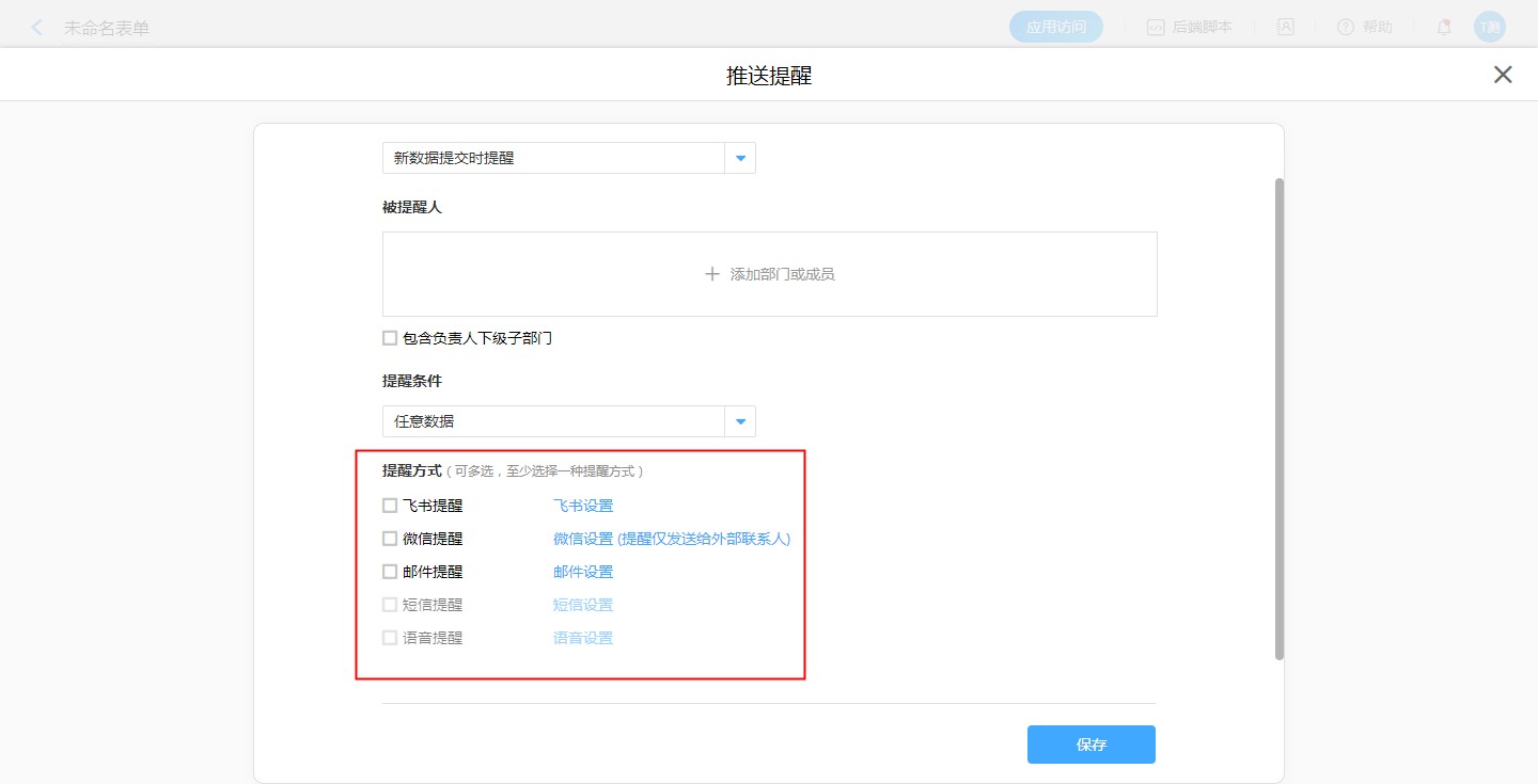 在设计表单-表单设置-推送提醒,提醒的方式可以勾选提醒的方式可以勾选飞书、邮件、短信、语音、微信(提醒仅发送给外部联系人)。