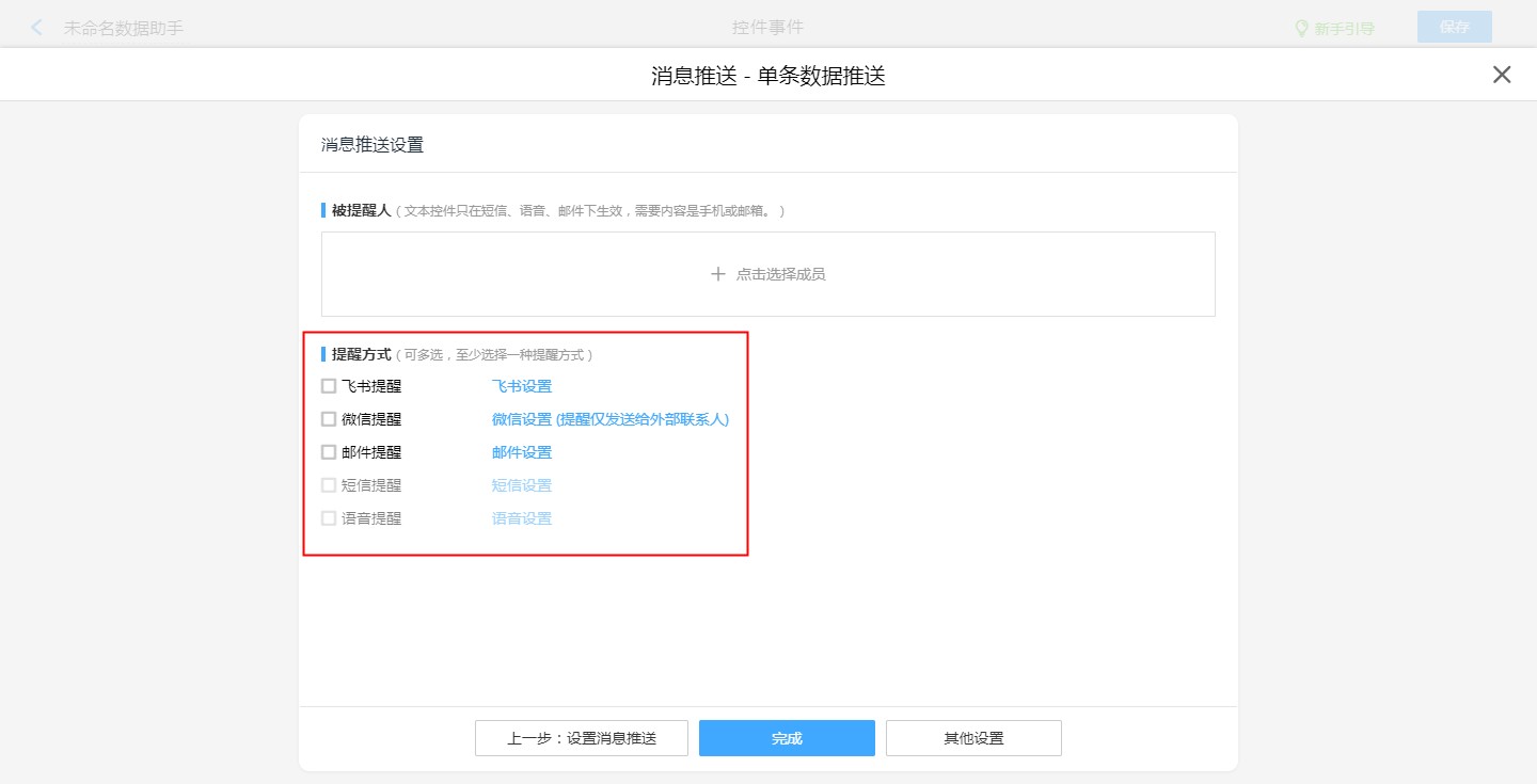 使用数据助手推送消息时,提醒的方式可以勾选提醒的方式可以勾选飞书、邮件、短信、语音、微信(提醒仅发送给外部联系人)。