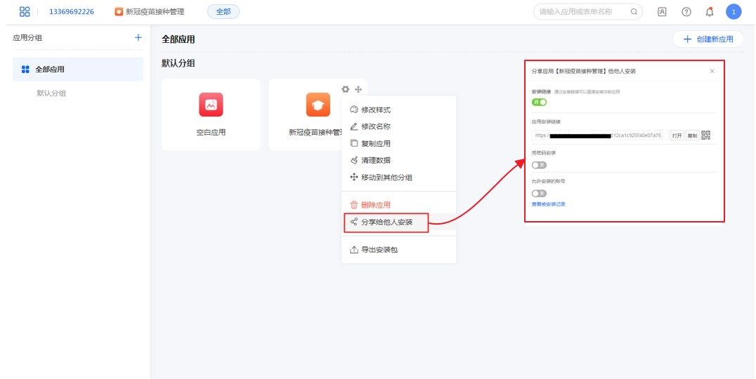 可以自由选择自己账号下的应用给其他人安装,只需开启安装链接,别人就可以通过链接或二维码扫码安装应用。