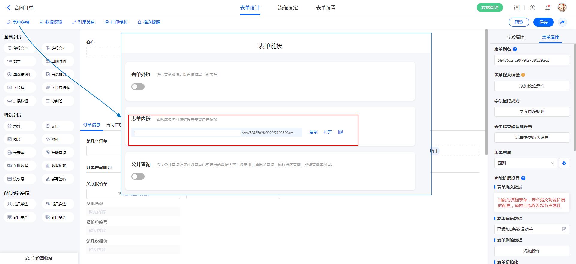 表单内链的打开方式:表单编辑页面 -> 表单链接 -> 表单内链。