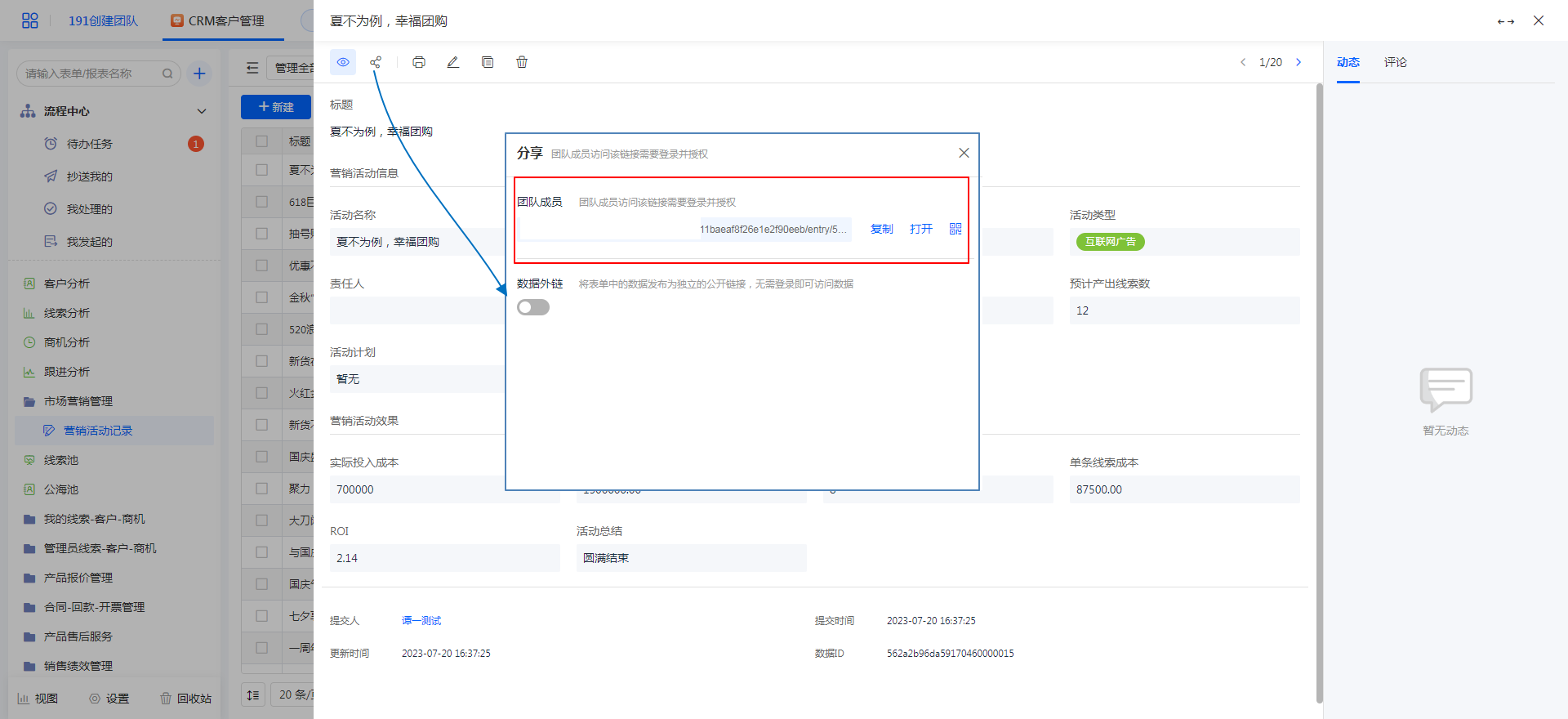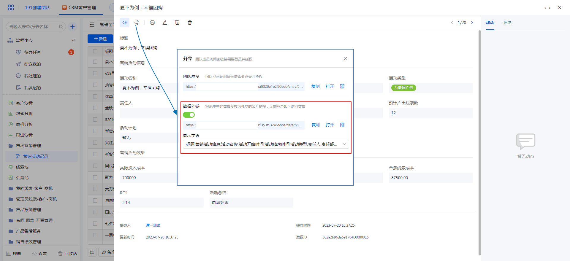 除对团队内成员可以进行表单和数据的分享外,还可以将表单或单条数据进行对外分享。