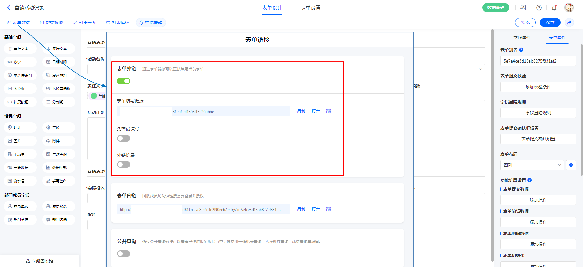 表单外链和表单内链类似,可以让团队外的成员快速访问当前表单;