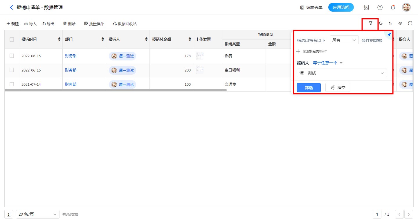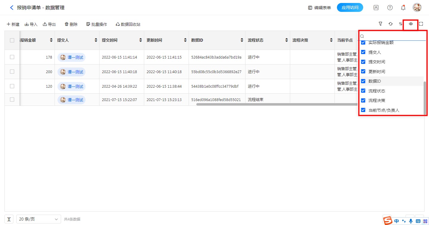 在数据管理页面,我们除了查看所有数据外,还可以对查看的数据进行筛选,这里包括数据内容的筛选条件和显示字段的筛选。