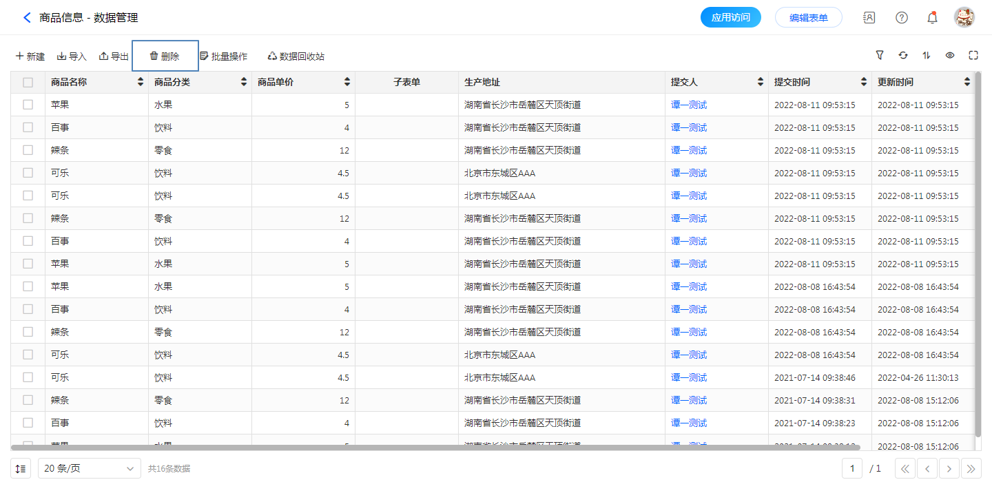 除了可以让团队成员在访问页面提交数据外,管理员还可以在数据管理新增或删除数据。
