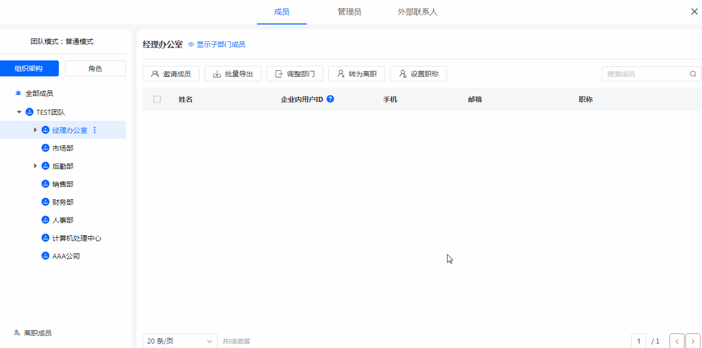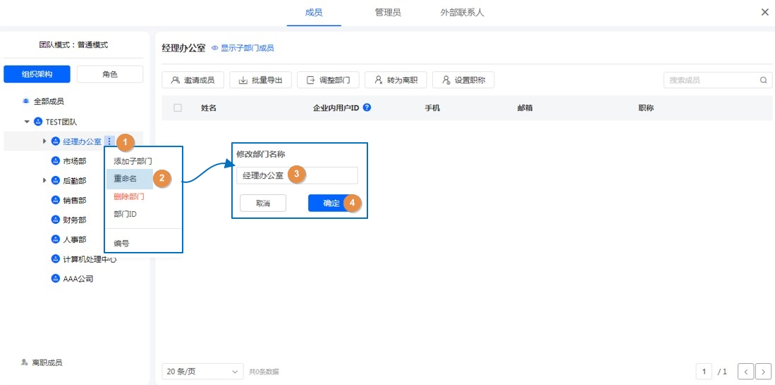 - 如果该部门内有成员,需要先将成员移动至其他部门才可删除这个部门。