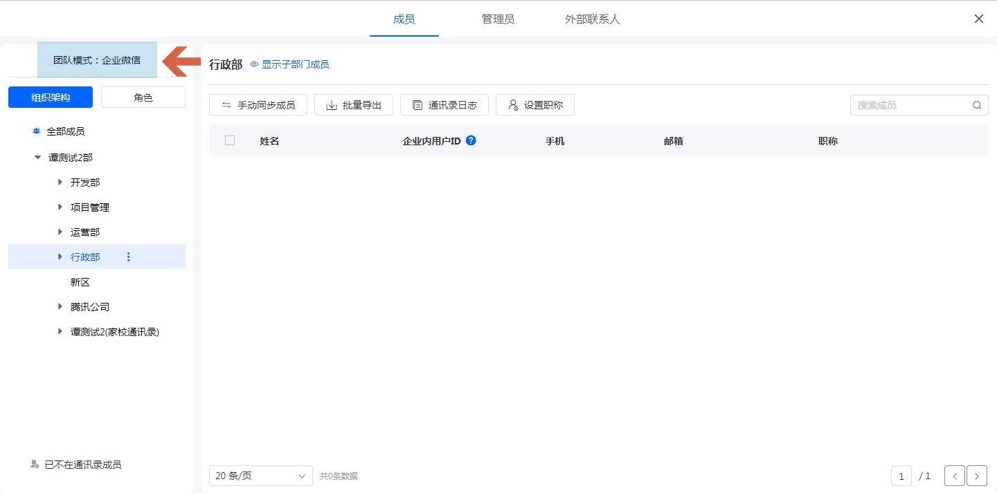 如果是易尚云账号的形式的团队则是普通模式,如果是企业微信/钉钉模式/飞书模式的团队,则需要在企业微信/钉钉/飞书管理后台同步组织架构。