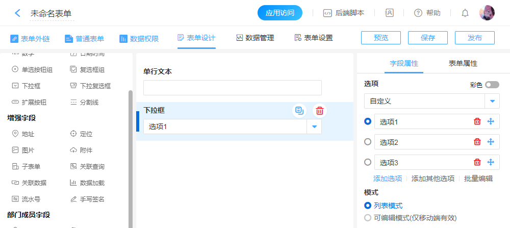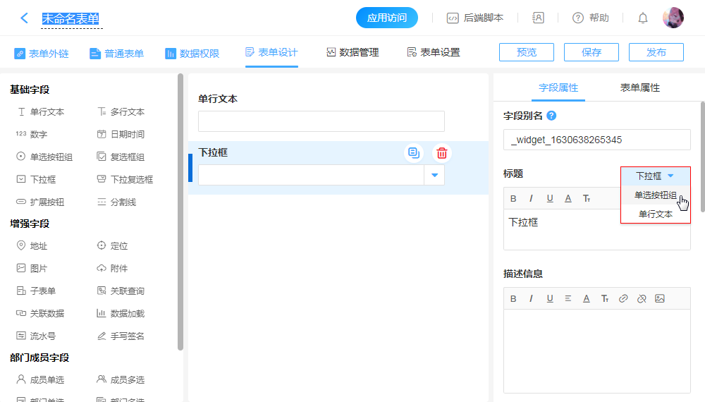 “下拉框”控件字段,可以修改转为“单选按钮组”或“单行文本”。