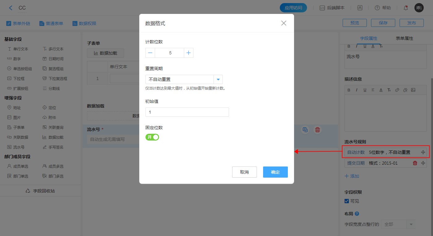 其中“自动计数”是默认必须添加的配置,该内容表达了流水号的数字序号。
