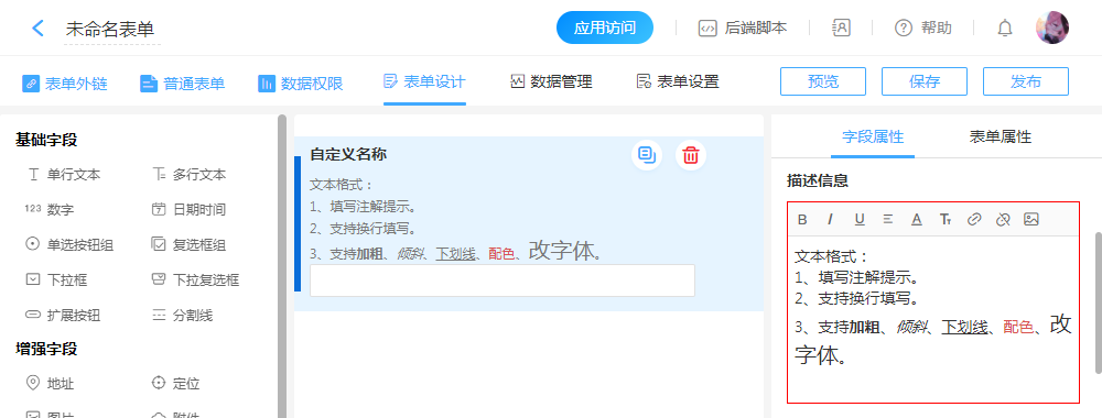 | 水印字段 | 支持设置本表单字段和定位、时间、提交人三个固定字段 注意:固定字段-定位需要地理位置授权 |