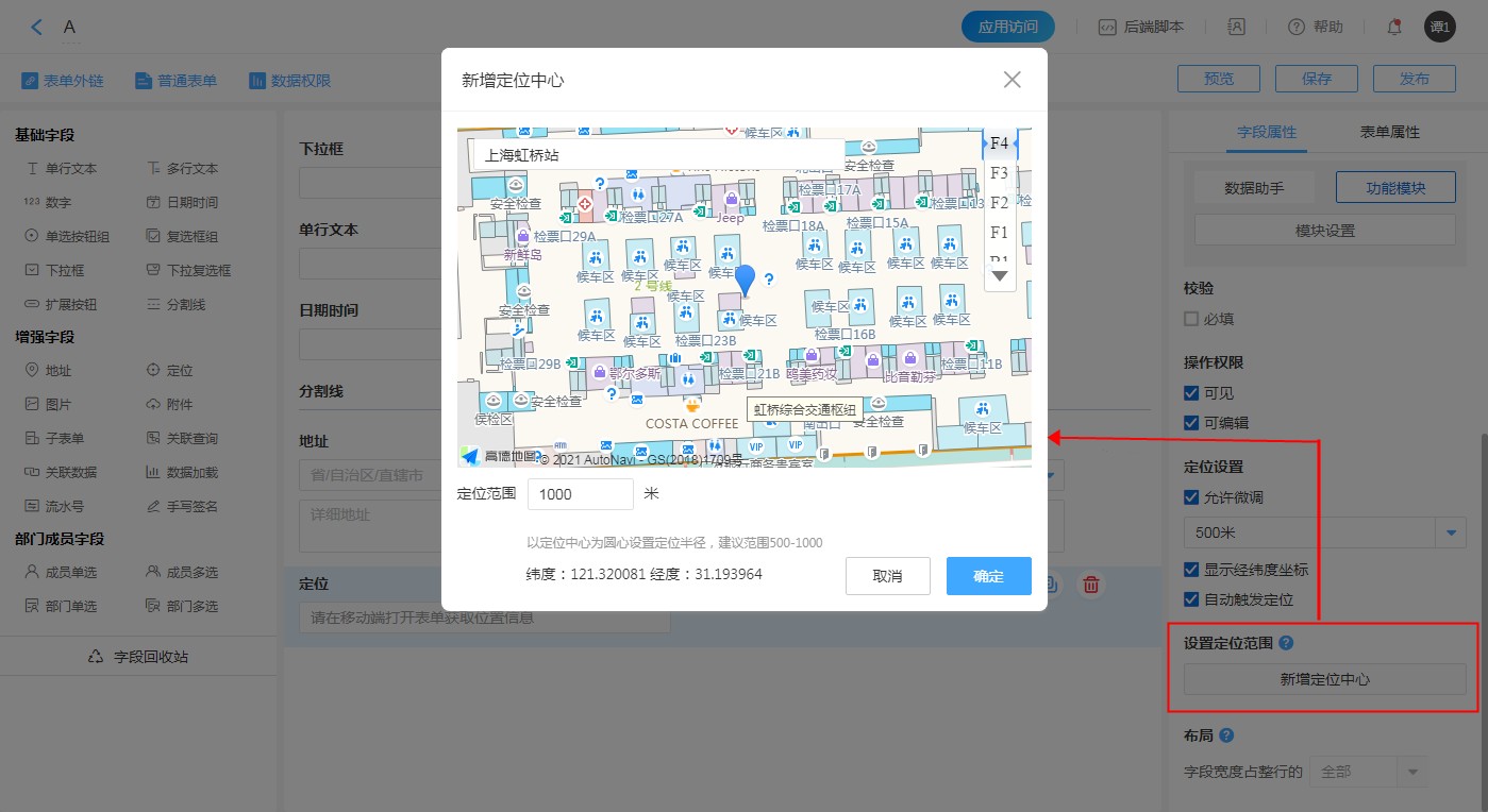 • (1)设置定位中心为“上海虹桥站”,定位范围为1000米。则在定位时,只有在距离该地点1000米之内,才可以提交。