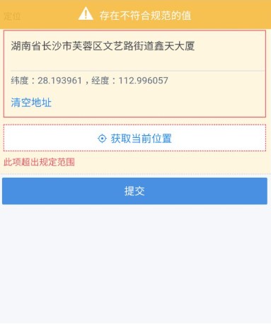 设置定位中心和定位范围,则定位时,处于以定位中心为圆心、以定位范围为半径之内的地点,才能通过校验进行提交,否则会提示超出规定范围。