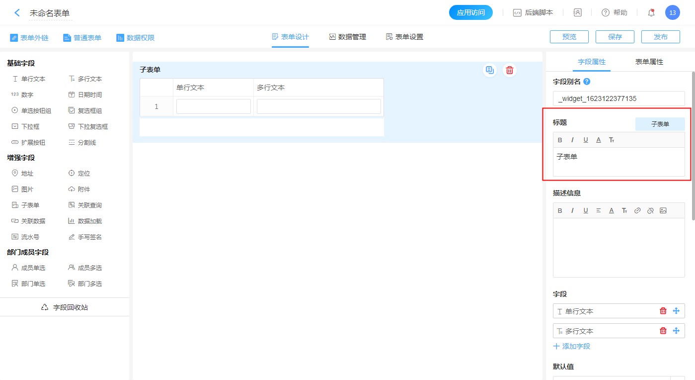 注意:关联数据、关联查询、附件、图片、手写签名,多行文本 不支持做为子表单数据标题。