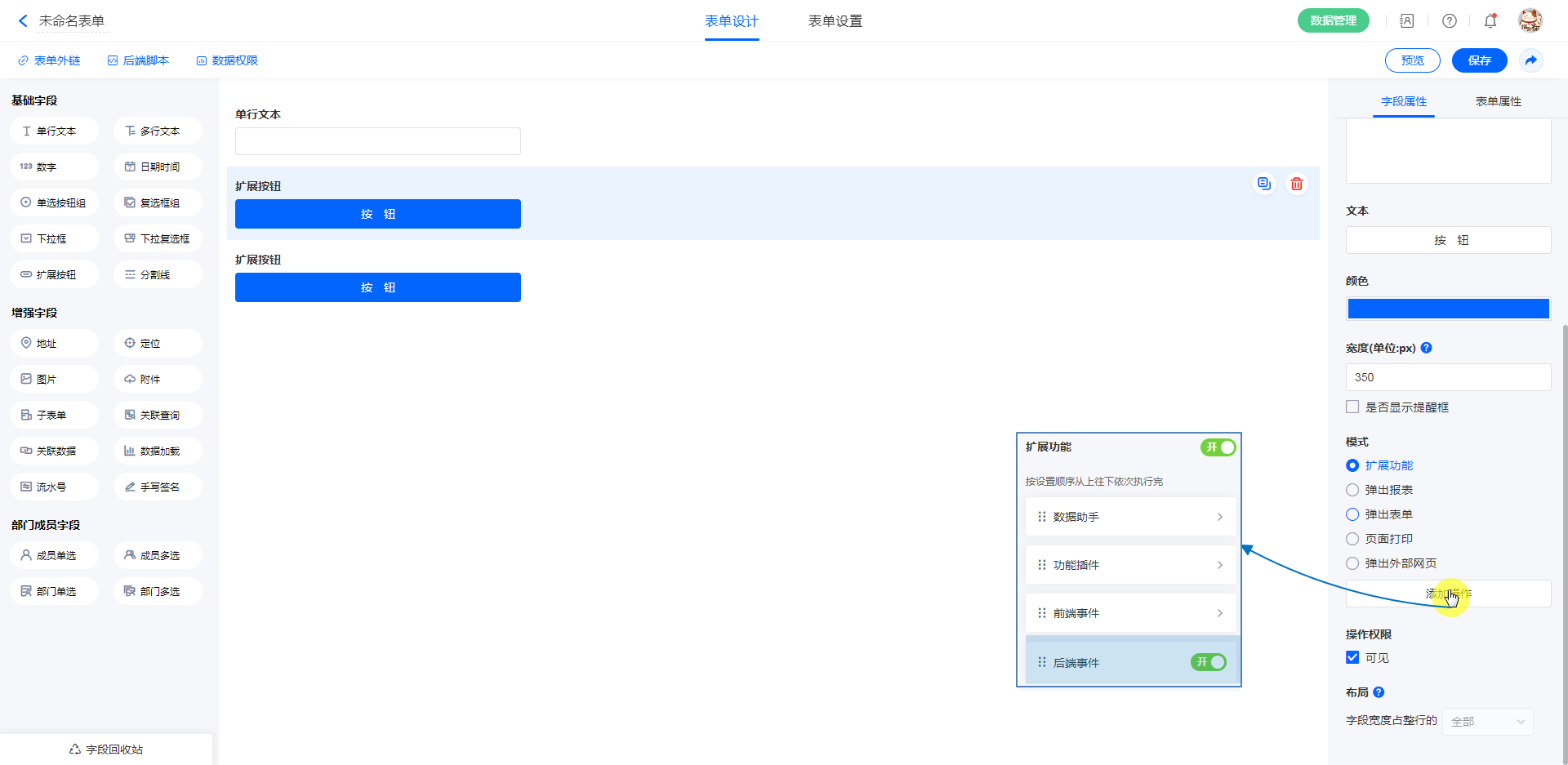 后端开发是扩展按钮基本功能之一,设置扩展按钮的属性为后端开发后,在点击扩展按钮后,会触发当前应用后端代码中_formevent事件,为表单的扩展性提供无限支持。