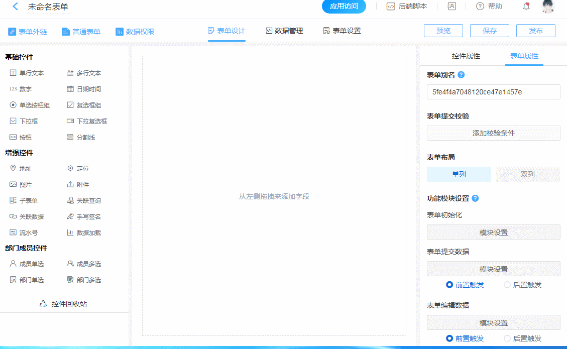 通过控件来创建字段。从左侧选择一个控件拖动至中间表单设计界面或点击控件右上角的加号,在右侧配置控件属性,即建立了一个字段。