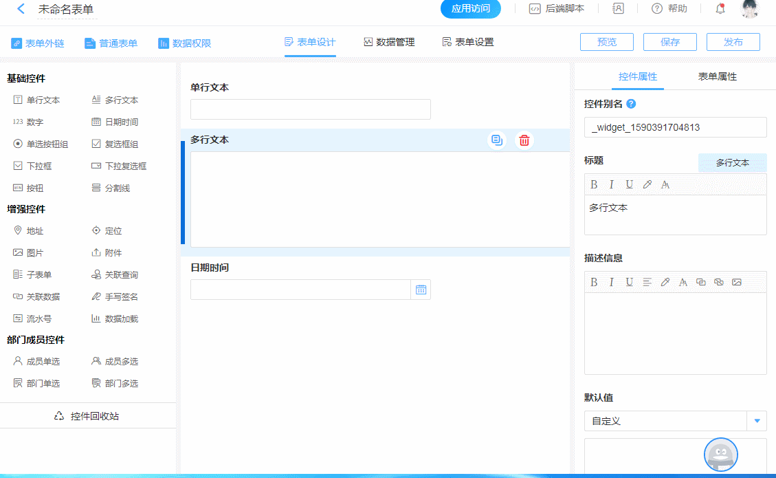 指用户在访问表单时,该控件的默认显示的值。部分控件可设置自定义、关联其他表单数据、数据联动、公式编辑。