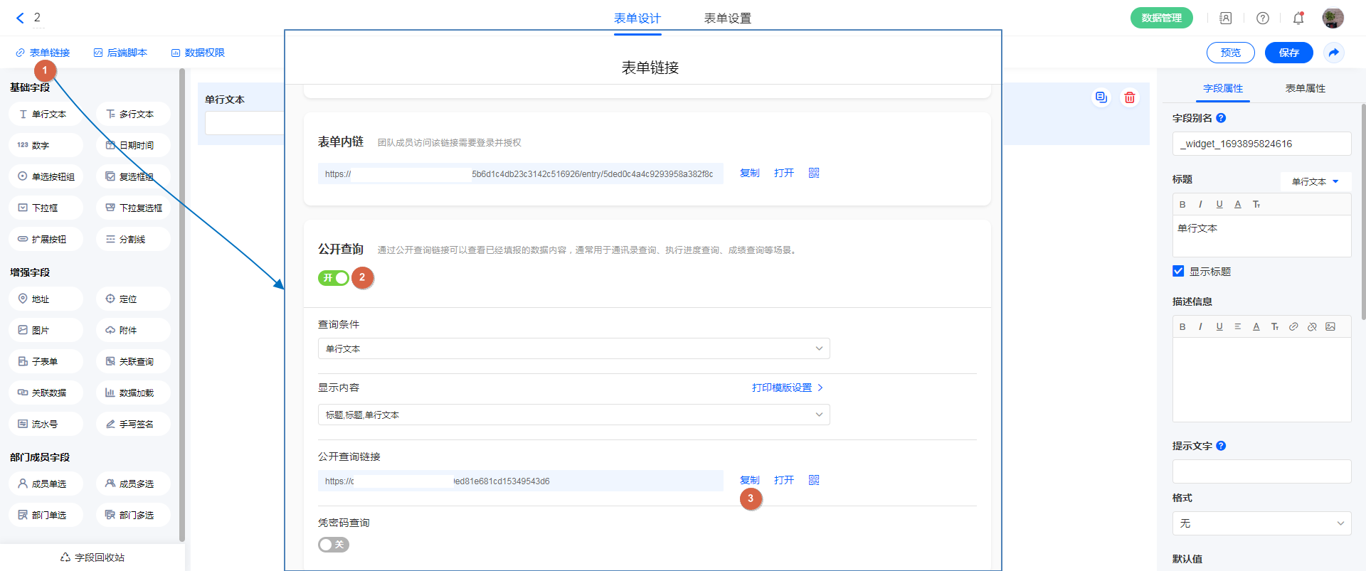操作步骤:表单“设计页面” > “表单链接”>>"公开查询"处开启公开查询,并设置查询条件与显示内容。