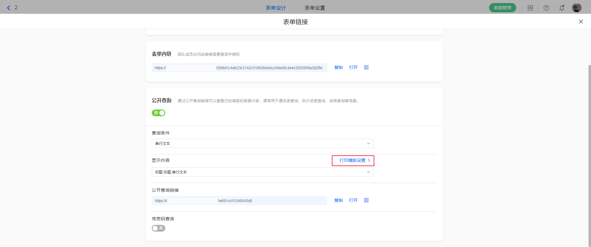 操作步骤:打开表单“设计页面” > “表单链接”> “公开查询”>“显示内容” > “打印模板设置”,配置公开查询外链专属打印模板。