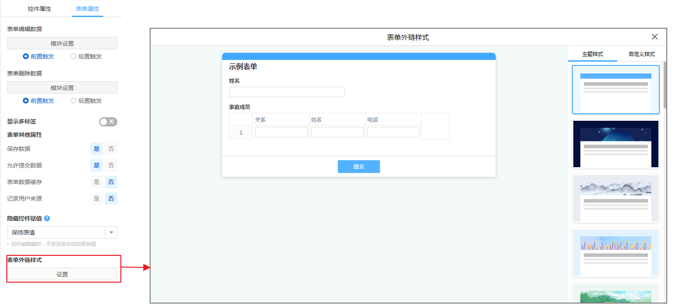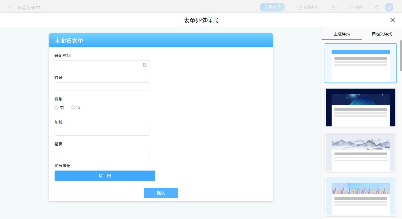 表单外链的样式分为主题样式和自定义样式,主题样式即易尚云内置的样式模板我们选择就可使用。自定义样式即由自己自定义设置。