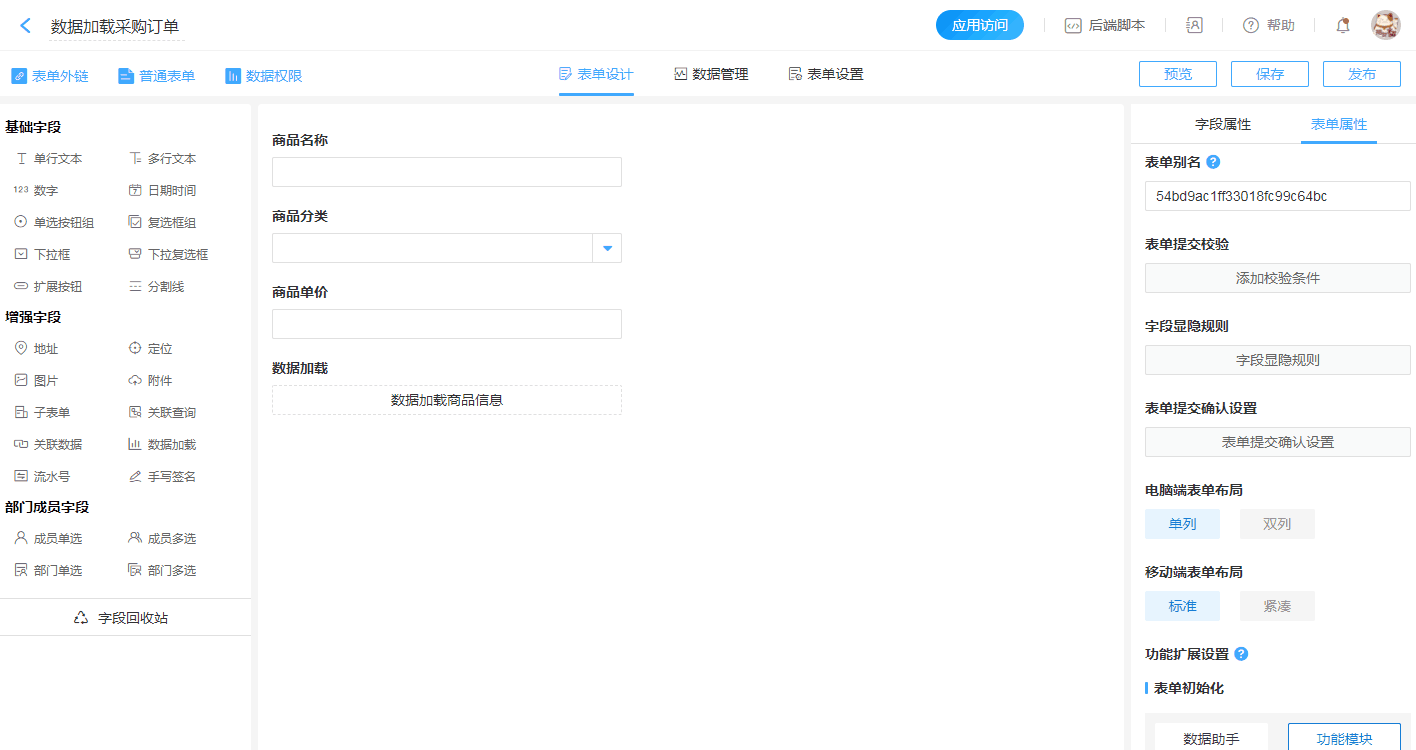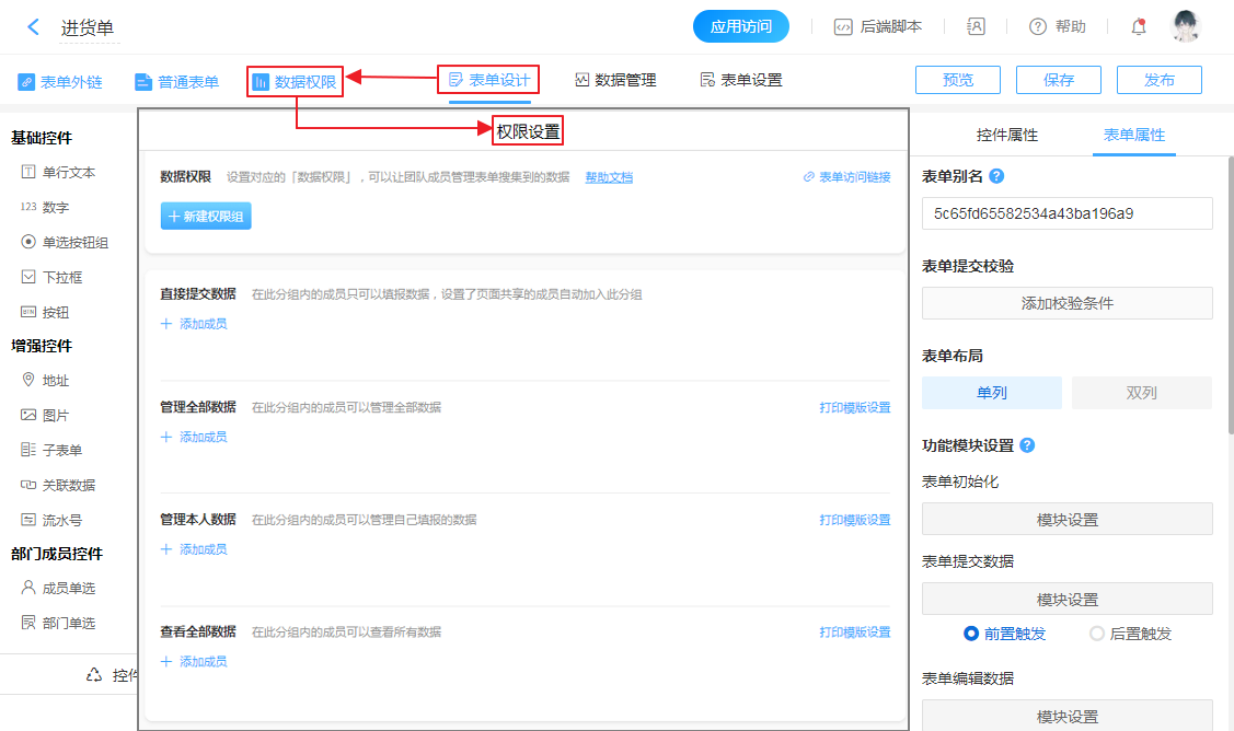 包括表单分享、管理全部数据、管理本人数据、查看全部数据、推送提醒管理以及打印模板的设置。