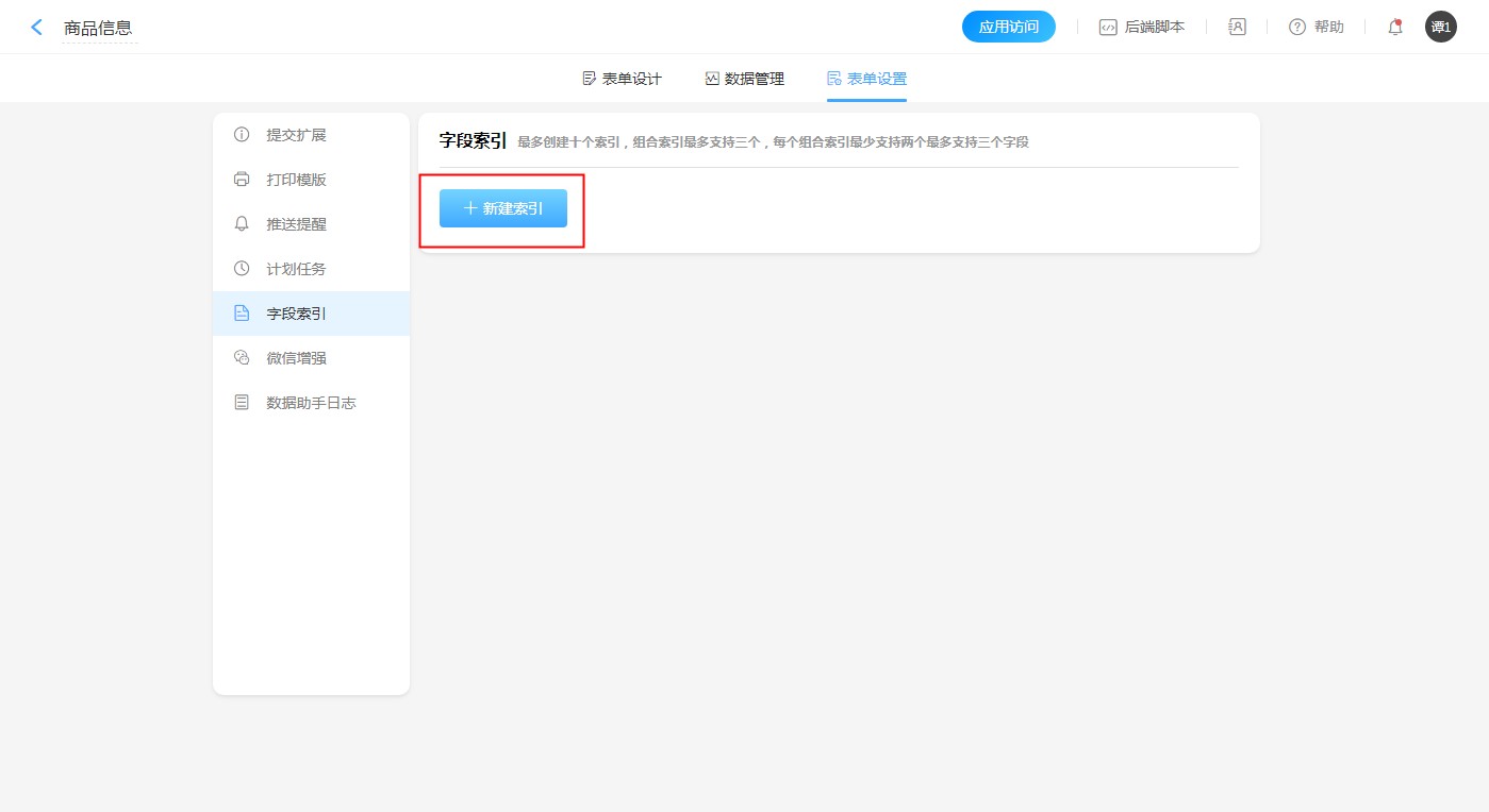 步骤:【表单设计】——【表单设置】——【字段索引】——【新建索引】