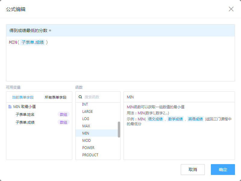 一般用于子表单中的数字字段获取最小值。