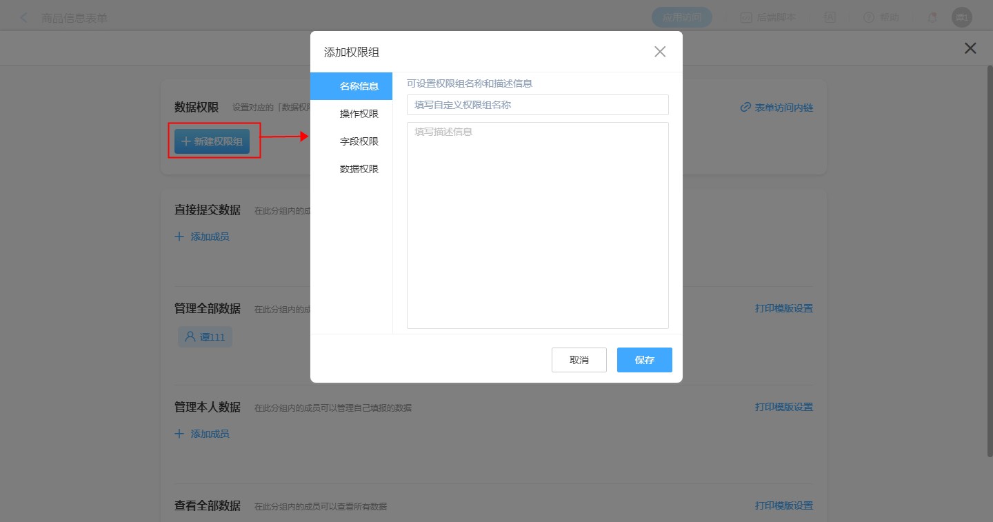 • 如果给出的预定义权限组,不满足需求,还可以自定义权限组。自定义权限组,可以根据实际需求,更加精确得控制不同成员的权限,具体参考数据权限。