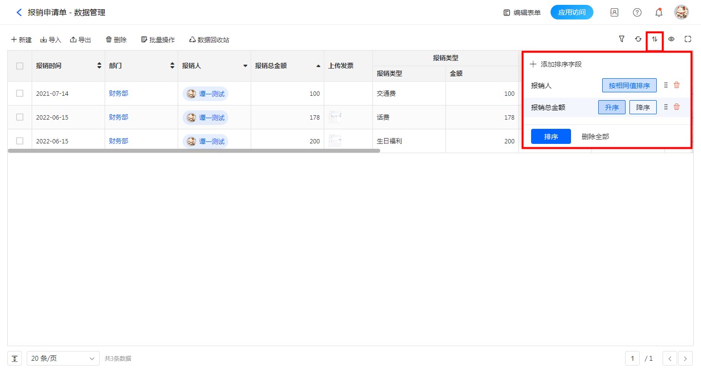 在数据管理和权限组查看数据时,可以直接点击表格右上角的排序图标设置排序规则,也可以点击表格中字段后方的排序图标进行排序,如果是部门成员类字段,还可以进行同值排序,即将同一个人或者同一个部门的数据排列在一起。