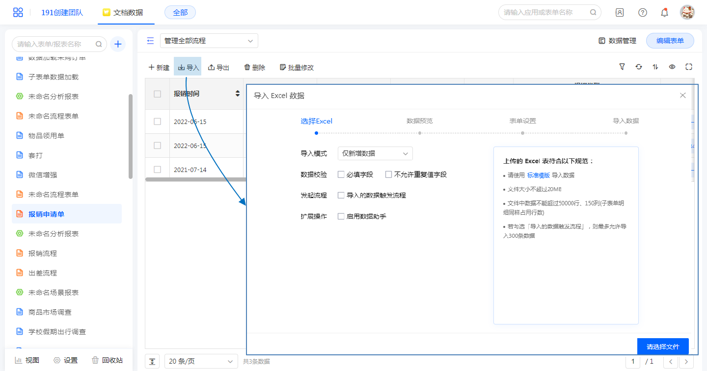 支持将本地excel文件导入到表单中,详情参考数据导入导出。