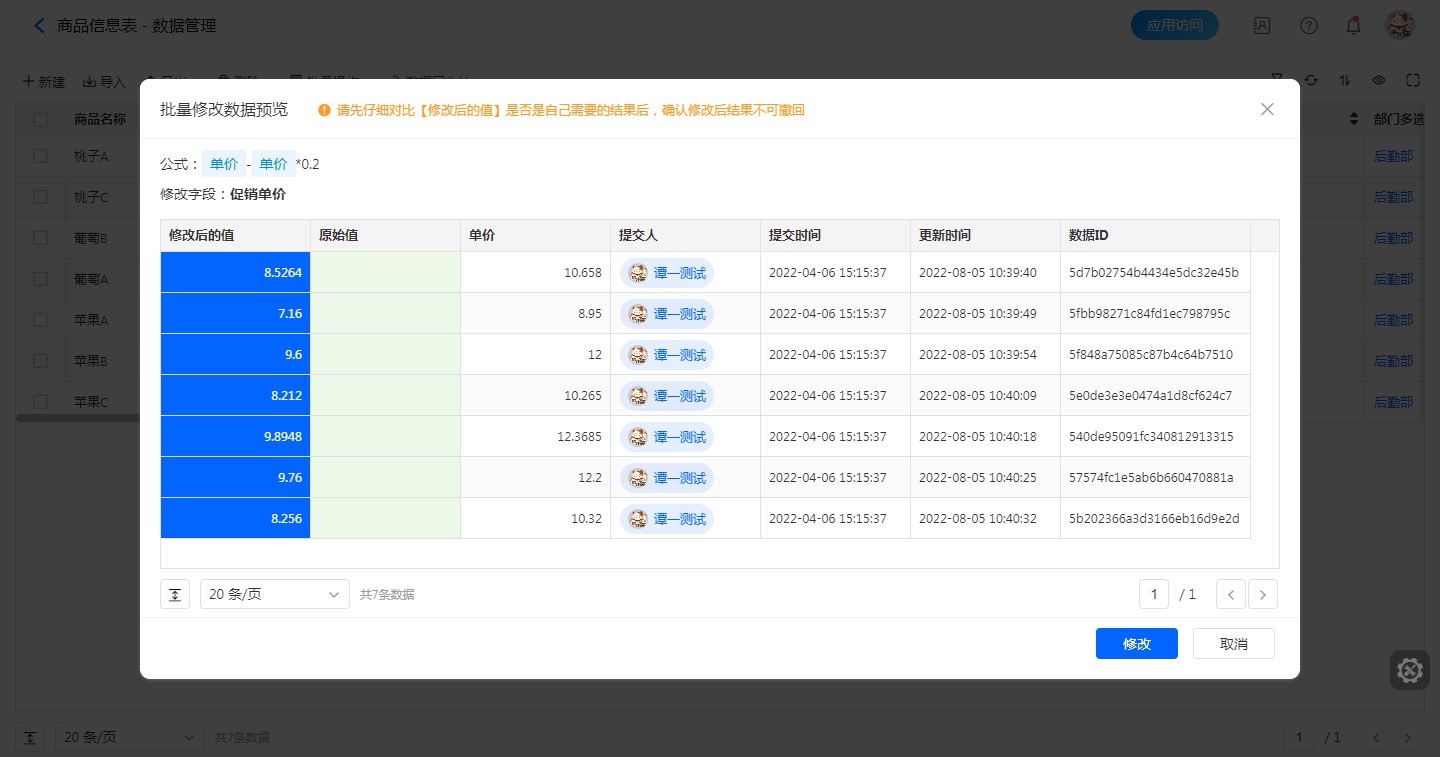 设置好固定值或者公式之后,点击[修改并预览]会进入批量修改数据预览弹窗,可仔细比对修改结果,确认无误后点击[修改]完成修改数据操作。