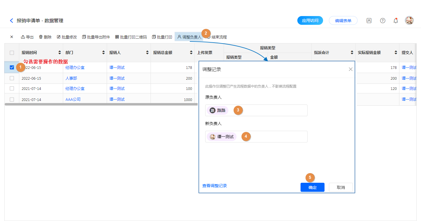 当某一表单有大量的流程数据,但员工已离职时,我们可以通过批量调整负责人移交他人处理。