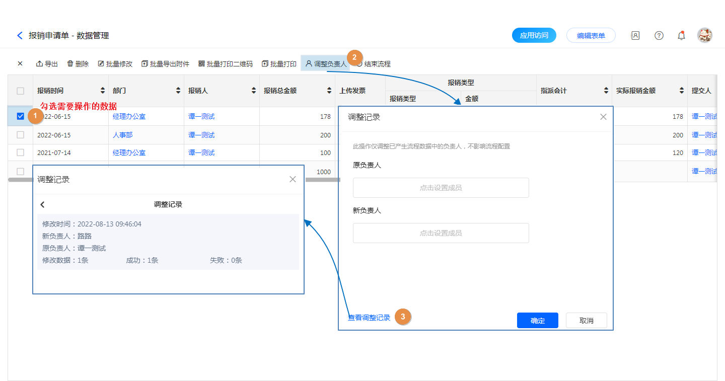 管理员登录,【应用访问】——【数据管理】——【勾选数据】——【调整负责人】——【查看调整记录】