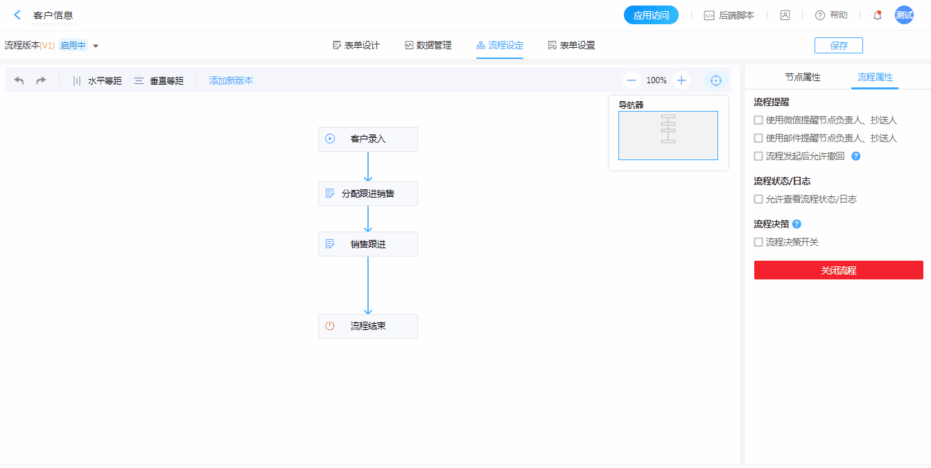在客户管理流程中,录入的新客户会分配给不同的销售去跟进,如果该销售1天内没有跟进这个客户,就回退到「分配跟进销售」节点,重新分配跟进销售,只需要给「销售跟进」节点设置超时1天后自动回退到上一节点即可。