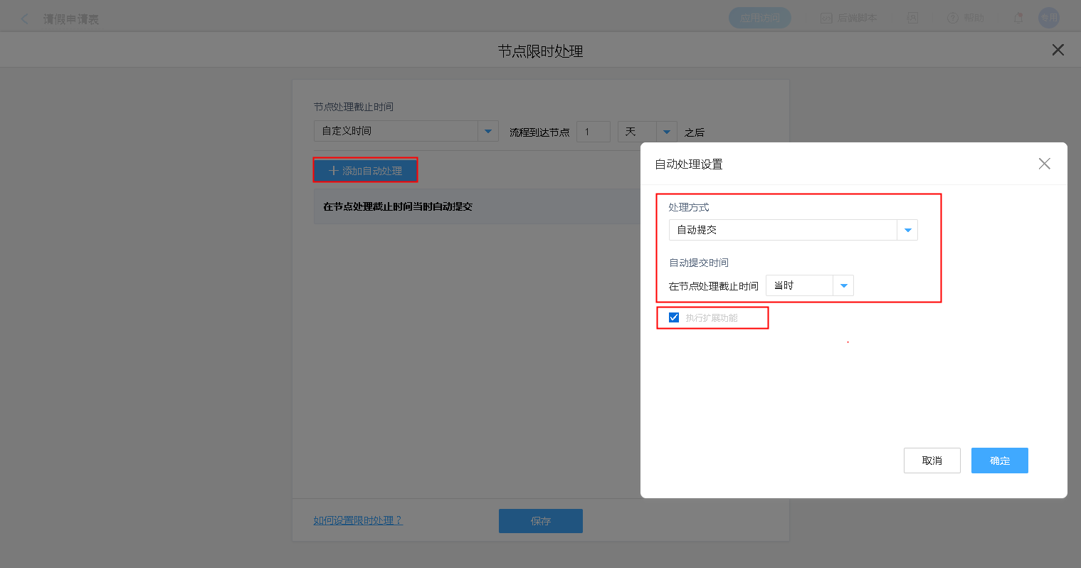 注意:自动提交时不进行表单校验(包括必填校验、审批意见校验、节点校验),不触发公式、联动、默认值获取,但可以通过设置自动处理设置中的执行扩展功能相关参数,触发节点内已配置好的功能插件、数据助手。