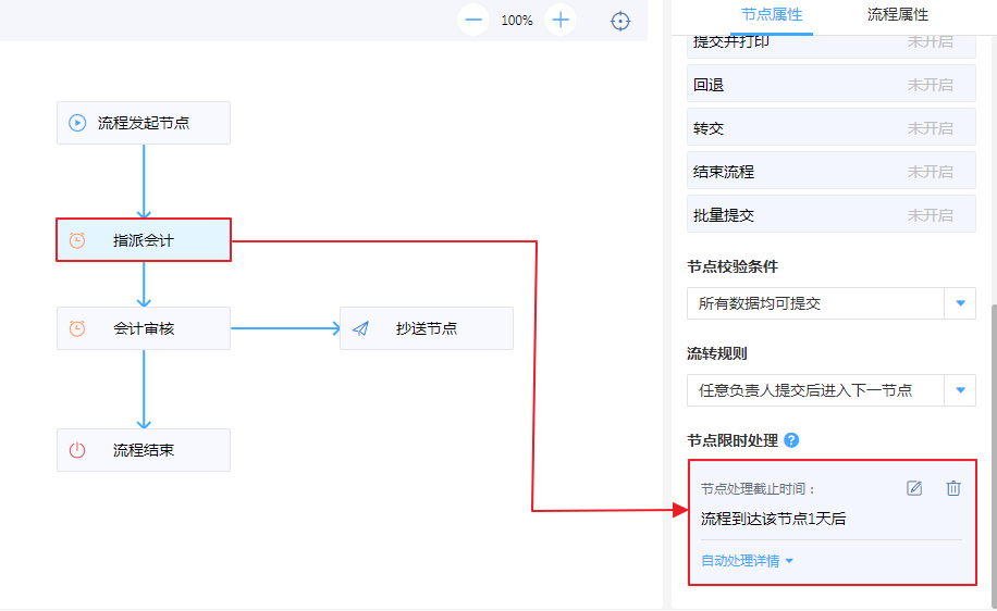 超时不处理视为同意申请。那么就可以为「指派会计」节点设置超时1天后自动提交,如果主管工作量太大而不能及时审批,就可以自动通过,避免流程停滞不前,让流程可以畅快流转。