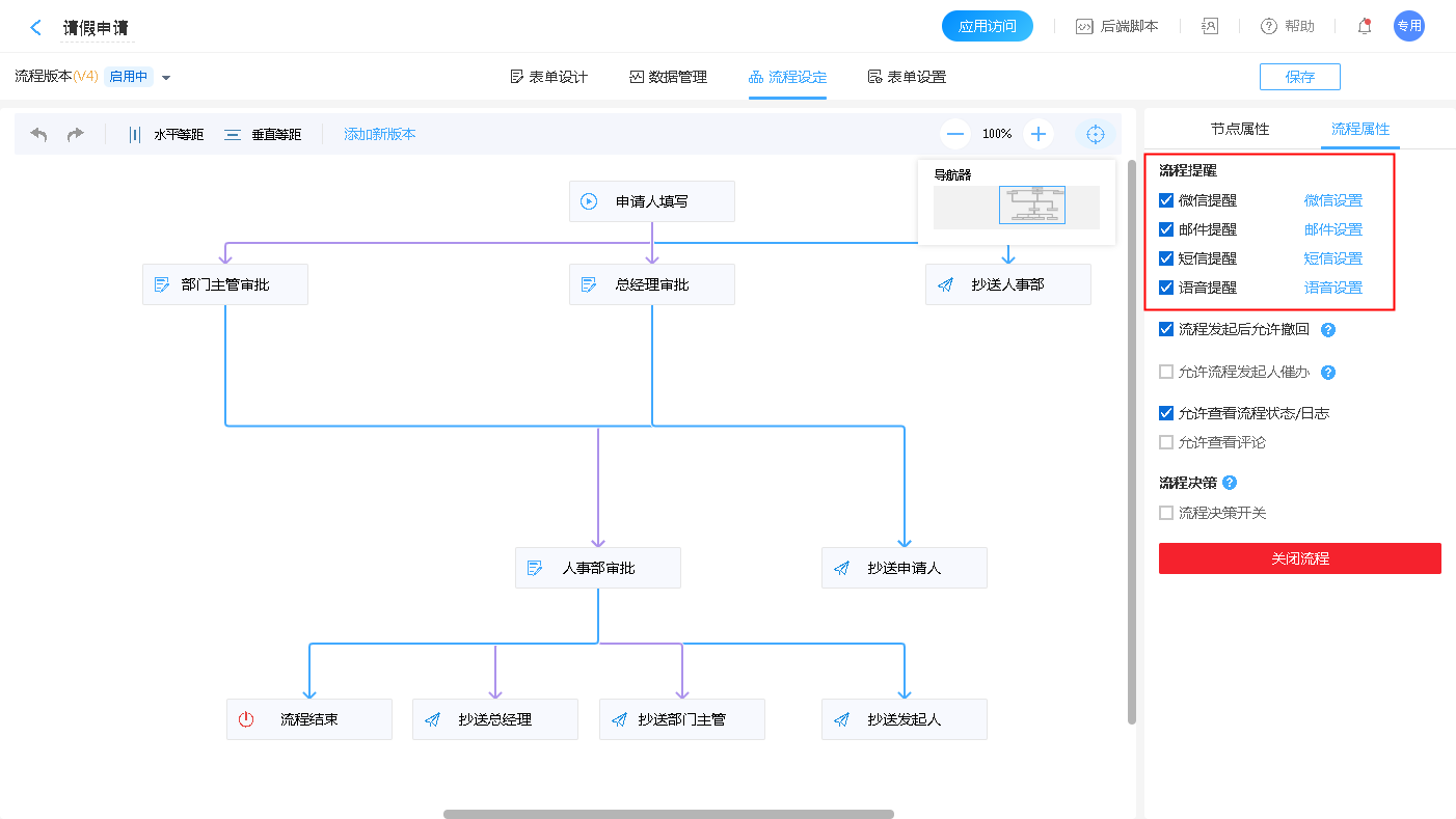流程提醒:流程待办/抄送消息,通过设定的消息渠道,推送给负责人,包含微信、邮件、短信、语音、钉钉、企业微信、飞书等渠道。